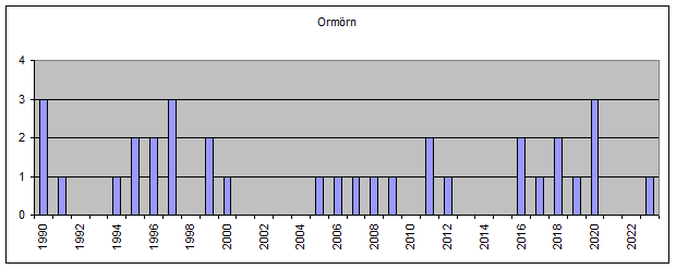 Ormörnar ses inte årligen i Sverige och sedan 2000 saknas fynd åren 2001, 2003-2004, 2010, 2013, 2015 och 2022.
