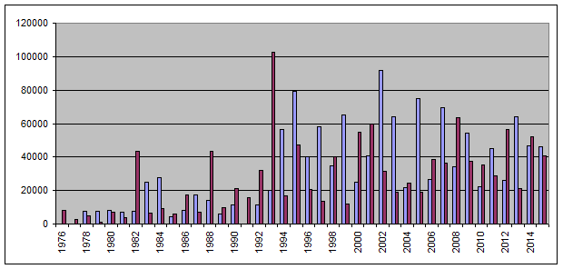 Figur 1: Sträcksiffror från Skåne 1976-2015. Vår = blå stapel, höst = röd stapel (Fåglar i Skåne).