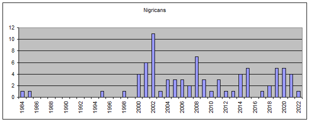 Figur 3: Antal nigricans i Skåne 1984-2022 (Fåglar i Skåne).