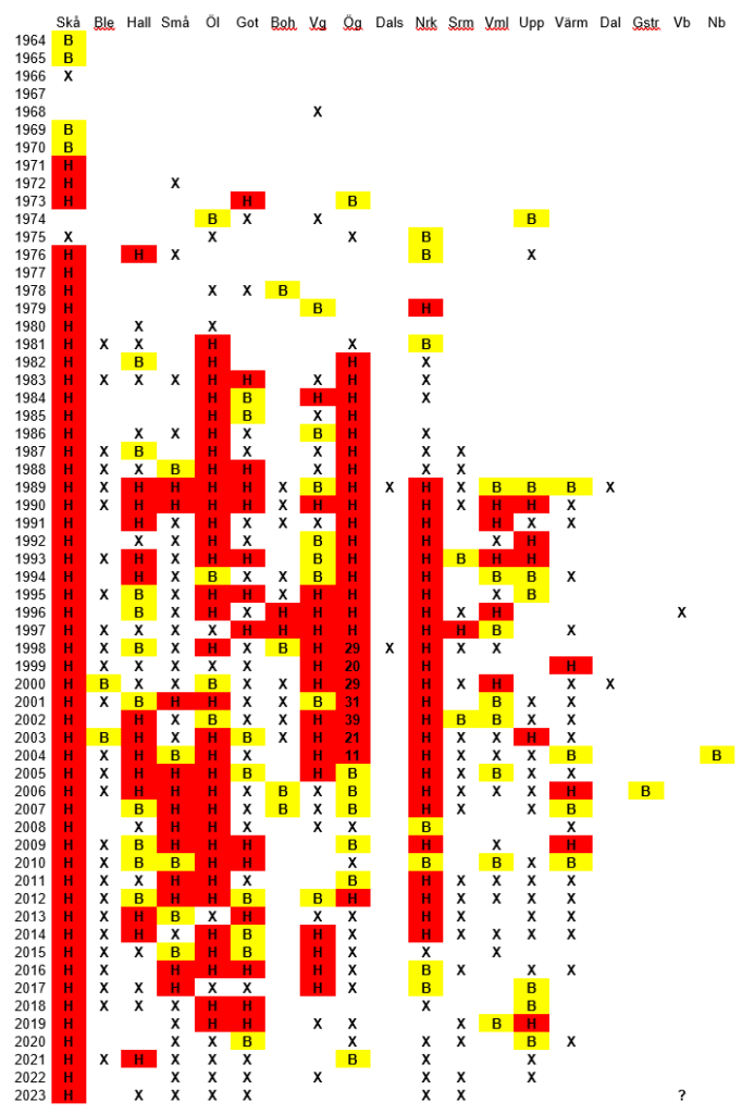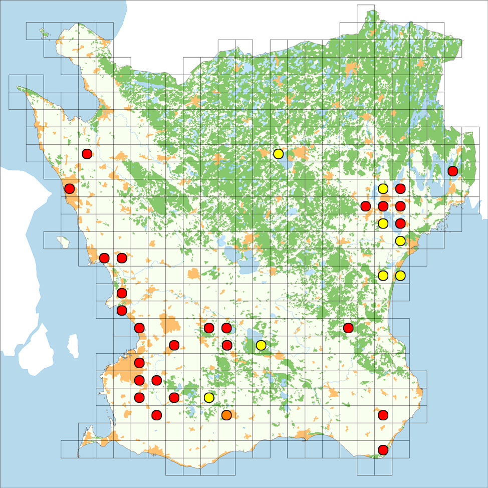 Figur 1: Förekomster av pungmes i de olika landskapen Röda rutor gäller häckningar, gula rutor bobyggen eller troliga häckningar och X står för observationer (Vår Fågelvärld, Fågelåret & Artportalen).