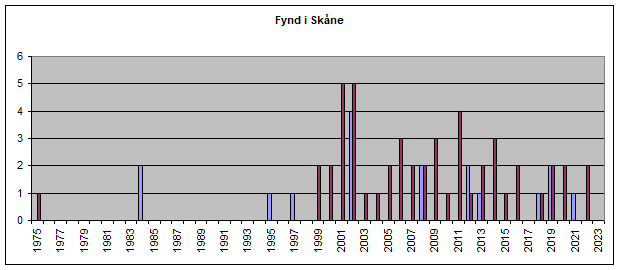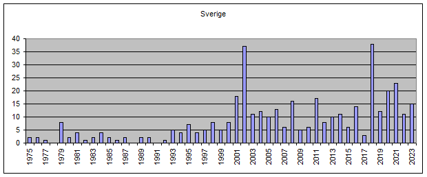 För perioden 1975-2023 ses antalet fynd per år i figur 2 och månadsfördelningen av fynden 1975-2023 visas i tabell 2. Fr.o.m. 1995 saknas fynd 1976, 1978, 2017 och 2023.