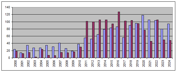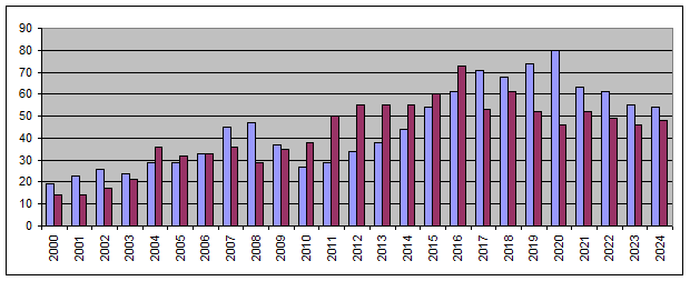 Jag saknar uppgifter om eventuella fynd 1970-1974. Förekomster i landskapet 1975-2024 visas nedan.