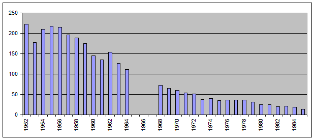 - 1950: En individ sågs på tre lokaler under perioden 3-6 maj (Curry-Lindahl 1959).