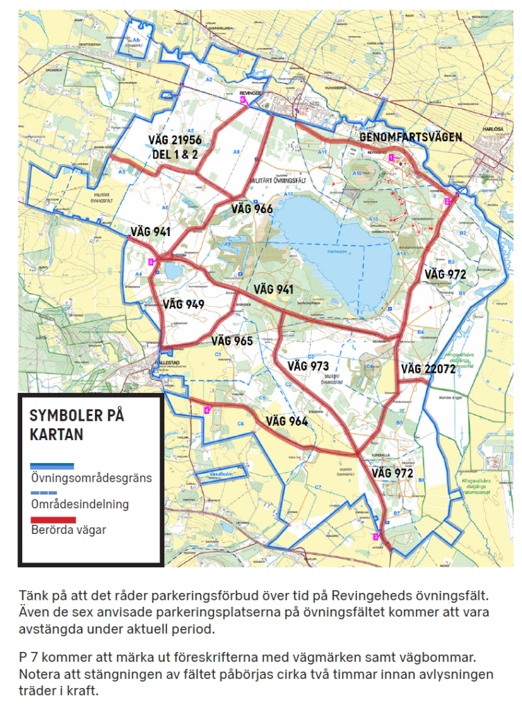 Revingehed: Under övningen är följande områden avspärrade* med anledning av farlig verksamhet: A1-A14, B1-B7, C1-C7 och Vasaholm. Undantag är boende på Revingheds övningsfält samt hemtjänst, skolskjuts, post, renhållning, utryckningsfordon eller näringsidkare med ärende på fältet.